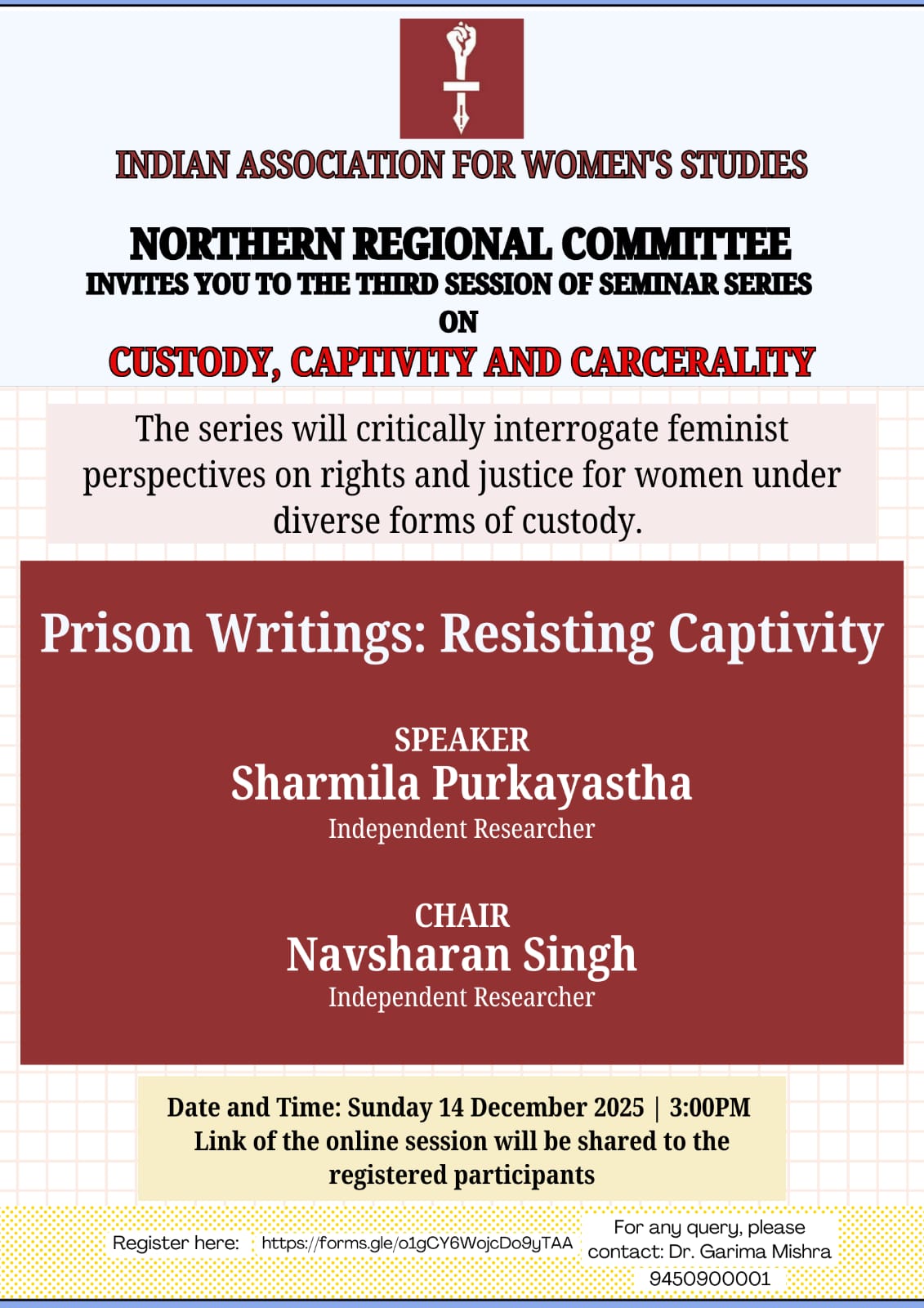 1. IAWS Northern Region Seminar Series on Custody, Captivity and Carcerality, Session-3, 14th December, 2025, 3:00 PM.